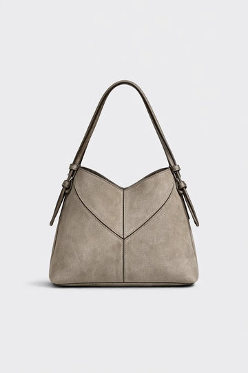 A modern shoulder bag featuring a unique V-shaped structural stitching on the front. This tote is crafted in a soft taupe-brown suède and features adjustable buckled straps and a wide, spacious opening, making it both a stylish and practical choice for everyday use.
