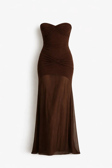 An elegant maxi dress featuring a captivating tie-dye pattern in organic shades of olive, sage, and deep forest green. The fluid silhouette is complemented by a soft, floor-length drape, making it an ideal choice for a sophisticated summer evening.