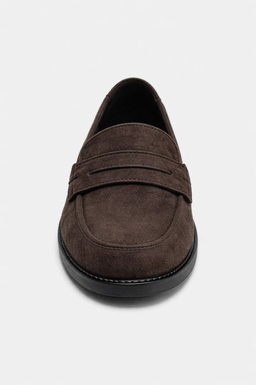 A timeless pair of men’s penny loafers crafted from premium chocolate brown suede. These shoes feature a classic apron-toe construction with a traditional penny strap across the vamp and are finished with a durable, low-profile dark rubber sole for both style and comfort.