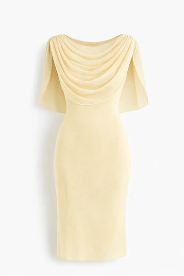 An exquisite evening dress in a soft pale yellow hue, designed to make a statement. This piece features a sophisticated draped cowl neckline that elegantly flows into a cape-like back. The body-skimming silhouette is crafted to enhance your natural form for a refined and timeless look.