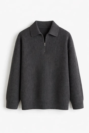 A premium heavyweight knit sweater in a versatile charcoal grey shade. This piece features a distinct ribbed texture throughout, a classic collar with a functional quarter-zip closure, and relaxed drop-shoulder sleeves for a modern, cozy aesthetic.