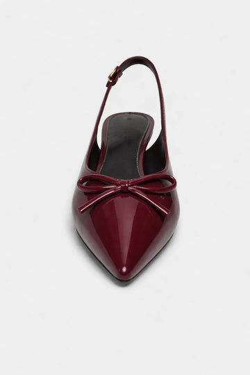 Sophisticated pointed-toe slingback heels in a deep burgundy patent finish. These elegant shoes feature a delicate bow detail on the vamp and a practical low block heel, finished with an adjustable ankle strap with gold-tone hardware