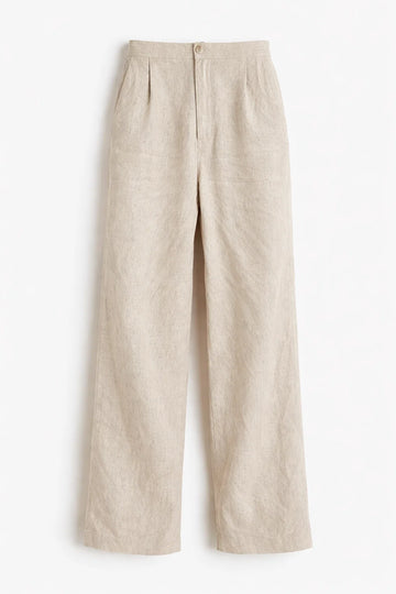 Sophisticated wide-leg trousers crafted from a breathable linen blend in a natural oatmeal shade. These pants feature elegant front pleats, a high-waisted fit, and a tailored silhouette that combines comfort with a timeless, high-end aesthetic.