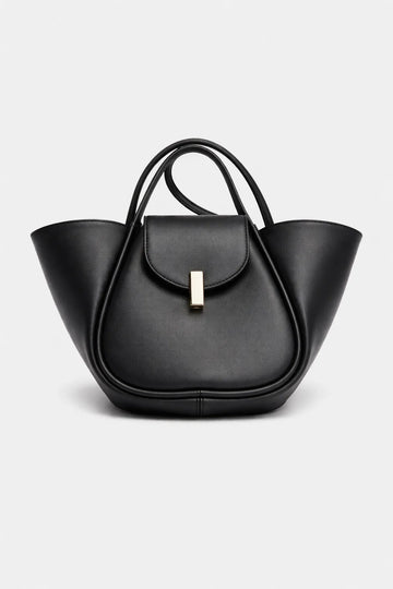 A modern shoulder bag featuring a unique architectural wing-shaped silhouette in a sleek black finish. It is designed with a front flap closure, a minimalist gold-tone metallic clasp, and long slender straps for effortless over-the-shoulder wear.