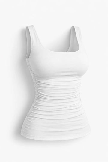 A chic and versatile white tank top featuring a modern square neckline and flattering ruched detailing along the sides. The streamlined silhouette and wide straps make it an essential layering piece for a polished, contemporary look.