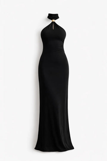 A sophisticated floor-length evening gown in a classic black finish. This dress features a high halter neckline secured with a prominent gold-tone ring detail and a sleek, form-fitting silhouette that exudes modern elegance.